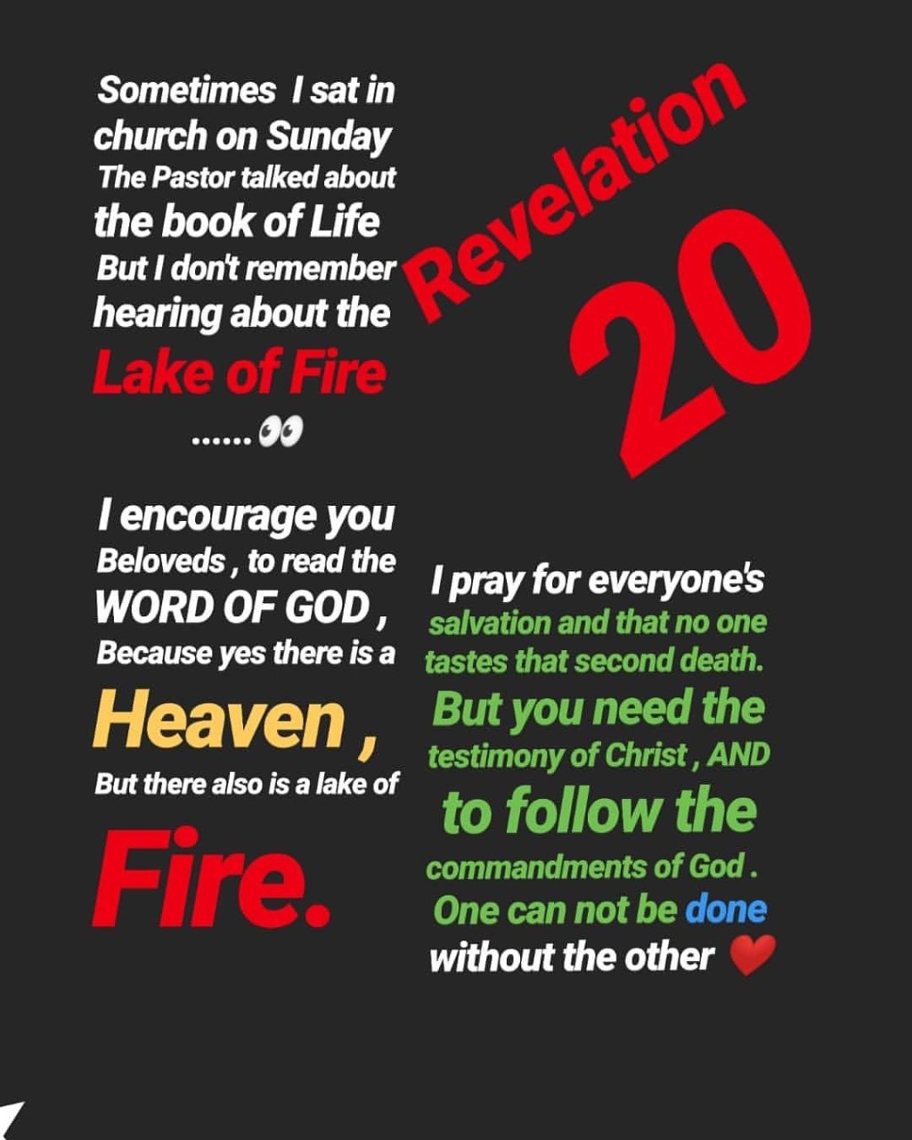 Beloved , when we hear many songs on the radio and sit in church service often we are reminded , of the salvation through Christ and the promise through Him of heaven. But I don’t hear of the Lake of Fire. The second death, for those who are not in the book of Life. Revelation 20″13 And the sea gave up the dead which were in it; and death and hell delivered up the dead which were in them: and they were judged every man according to their works.