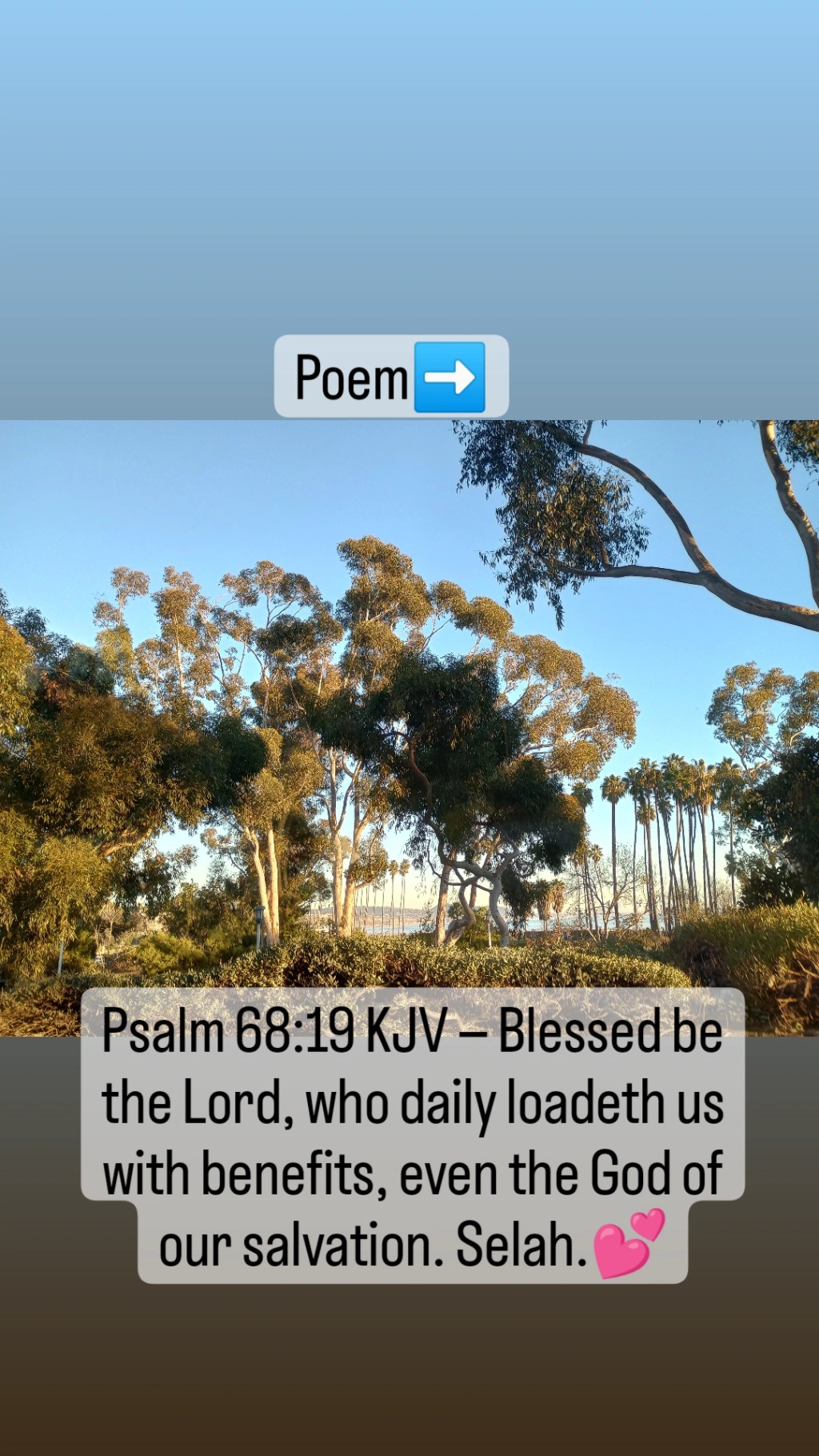 Psalm 68:19 KJV — Blessed be the Lord, who daily loadeth us with benefits, even the God of our salvation. Selah.🖤