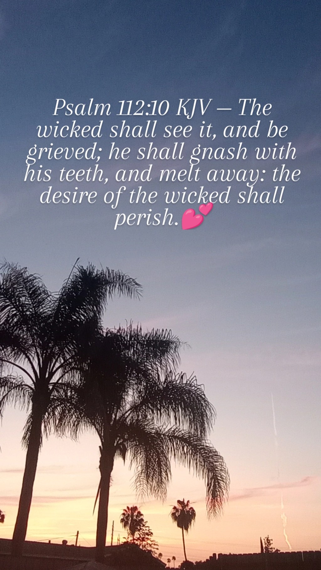 Psalm 112:10 KJV — The wicked shall see it, and be grieved; he shall gnash with his teeth, and melt away: the desire of the wicked shall perish.💕