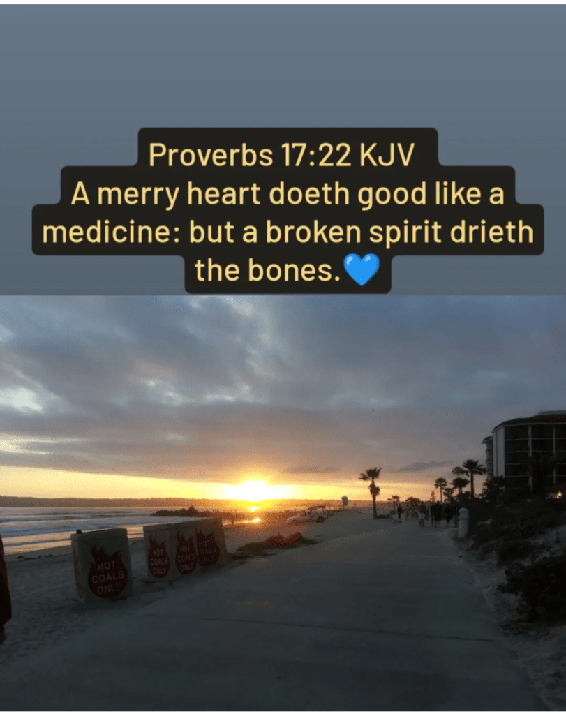 Proverbs 17:22 KJV — A merry heart doeth good like a medicine: but a broken spirit drieth the bones.💙