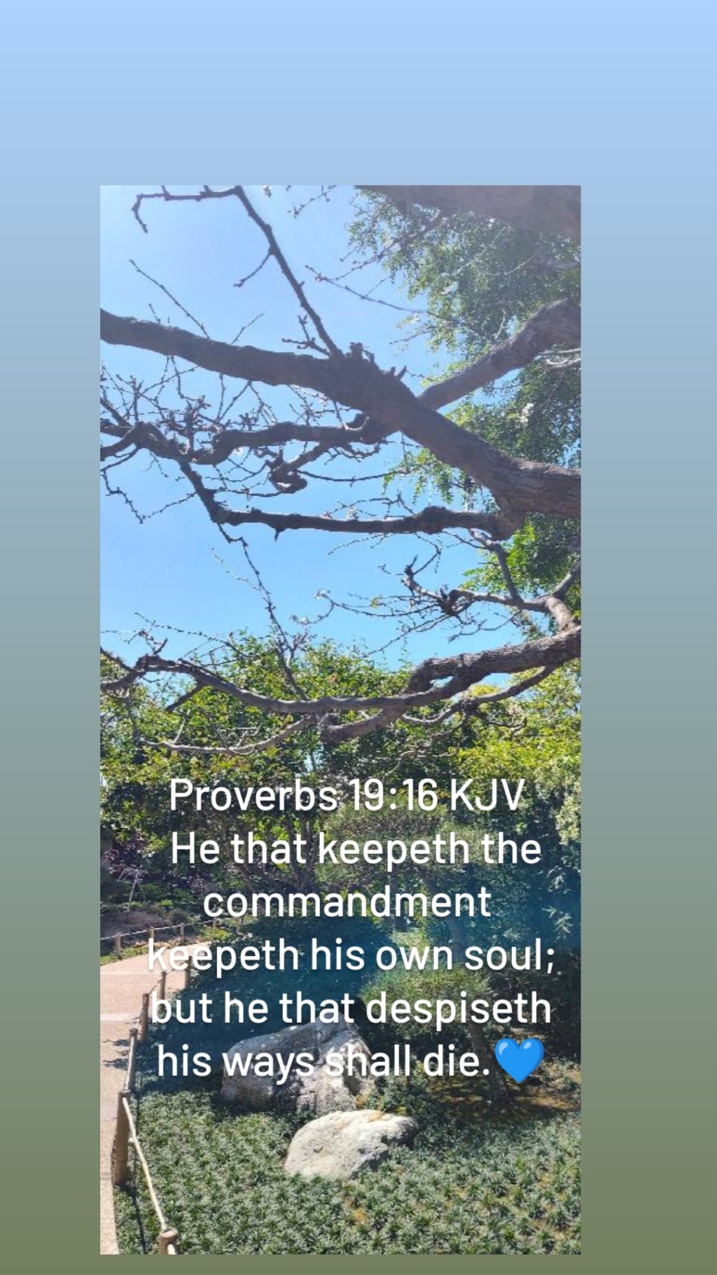 Proverbs 19:16 KJV — He that keepeth the commandment keepeth his own soul; but he that despiseth his ways shall die.🥰