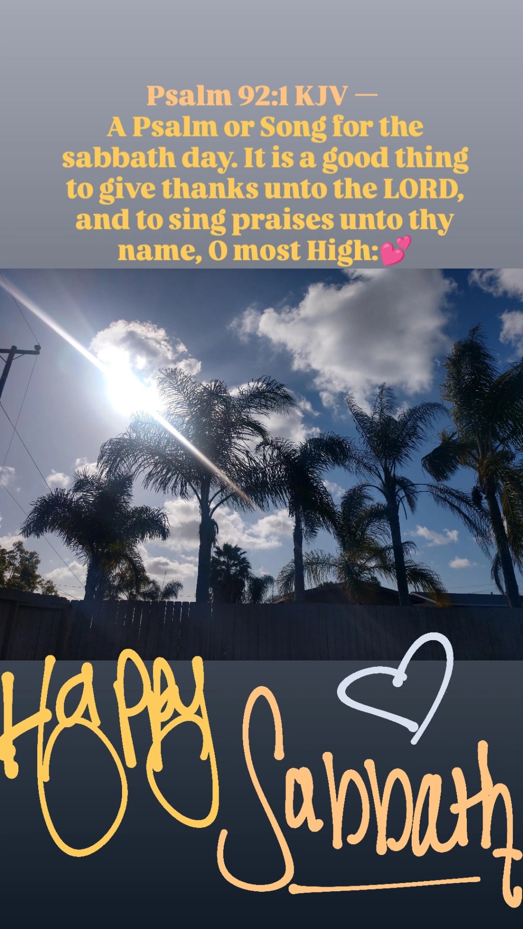 Psalm 92:1 KJV — A Psalm or Song for the sabbath day. It is a good thing to give thanks unto the LORD, and to sing praises unto thy name, O most High:💕