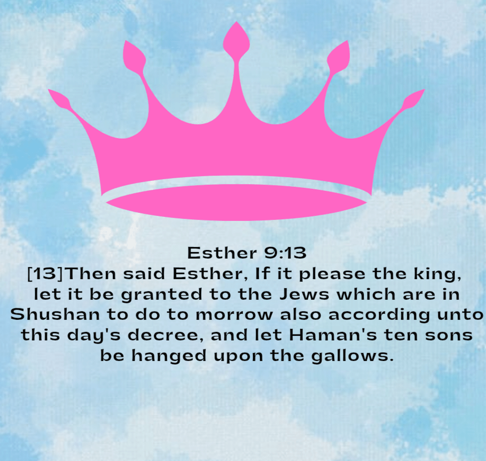 [13]Then said Esther, If it please the king, let it be granted to the Jews which are in Shushan to do to morrow also according unto this day’s decree, and let Haman’s ten sons be hanged upon the gallows.