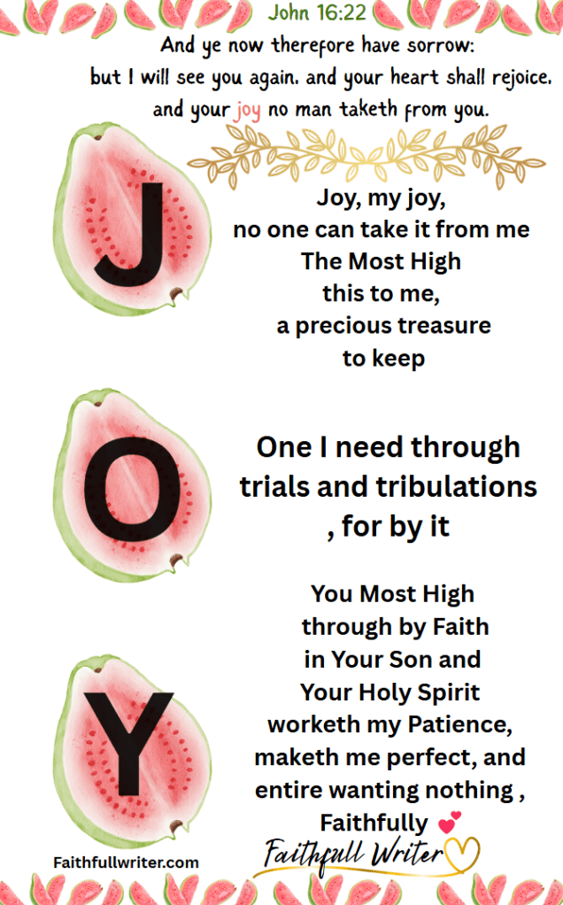 Y💕ou Most High through by Faith in Your Son and Your Holy Spirit worketh my Patience, maketh me perfect, and entire wanting nothing ,